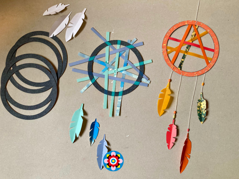 Vi anvender pap og papirstrimler, som kan gøre arbejdet helt simpelt for små og begyndere, men også mere avanceret (med blandt andet papirperler) for ældre og øvede. Du må tage drømmefangeren med hjem og kan hænge den ved din seng.